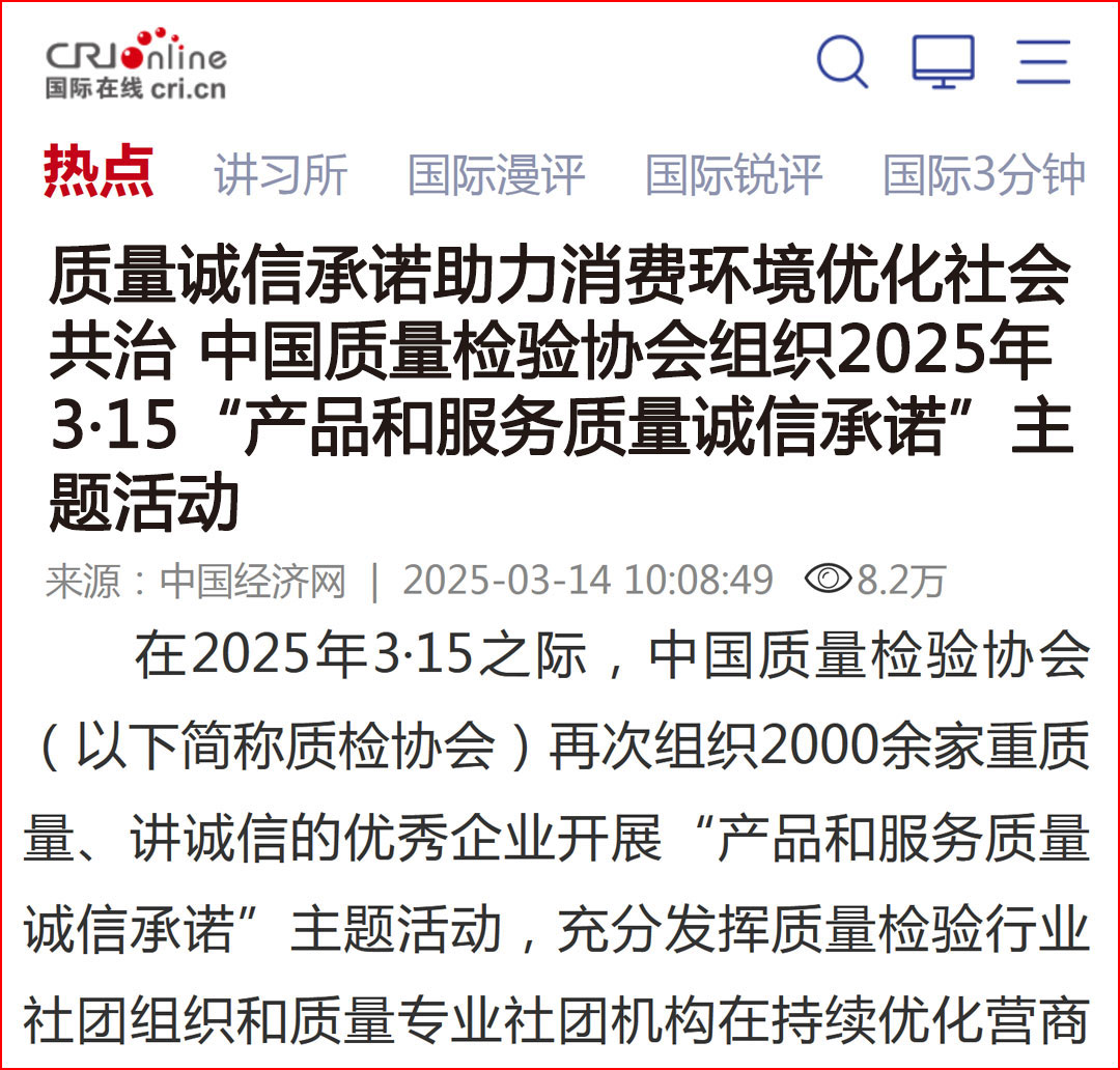 中國經(jīng)濟(jì)網(wǎng)“質(zhì)量經(jīng)濟(jì)頻道”發(fā)布:中國質(zhì)量檢驗(yàn)協(xié)會(huì)開展2025年3·15“產(chǎn)品和服務(wù)質(zhì)量誠信承諾”主題活動(dòng)