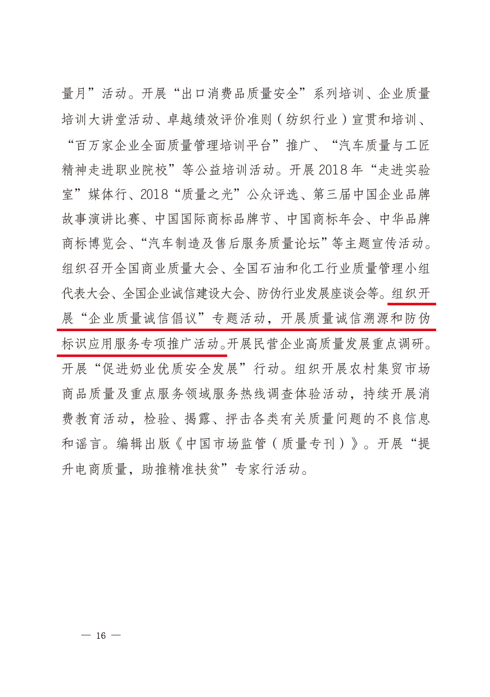2018年8月16日,國(guó)家市場(chǎng)監(jiān)督管理總局、中共中央宣傳部、國(guó)家發(fā)展和改革委員會(huì)、教育部、科學(xué)技術(shù)部、工業(yè)和信息化部、公安部、人力資源和社會(huì)保障部等2018年全國(guó)“質(zhì)量月”活動(dòng)主辦單位聯(lián)合印發(fā)《市場(chǎng)監(jiān)管總局等關(guān)于開展2018年全國(guó)“質(zhì)量月”活動(dòng)的通知》(國(guó)市監(jiān)質(zhì)〔2018〕131號(hào)),并在《2018年全國(guó)“質(zhì)量月”主辦單位開展的主要活動(dòng)》中明確部署中國(guó)質(zhì)量檢驗(yàn)協(xié)會(huì):組織開展“企業(yè)質(zhì)量誠(chéng)信倡議”專題活動(dòng),開展質(zhì)量誠(chéng)信溯源和防偽標(biāo)識(shí)應(yīng)用服務(wù)專項(xiàng)推廣活動(dòng)。