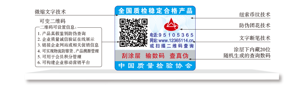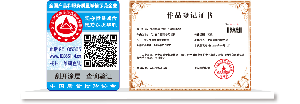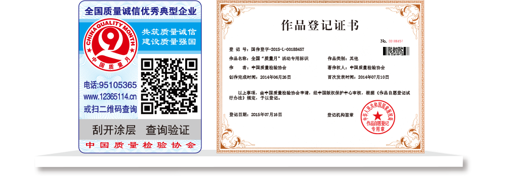 【“全國(guó)質(zhì)檢穩(wěn)定合格產(chǎn)品”專用標(biāo)識(shí)】具有專屬的知識(shí)產(chǎn)權(quán)(經(jīng)中國(guó)版權(quán)保護(hù)中心審核,國(guó)家版權(quán)局對(duì)“全國(guó)質(zhì)檢穩(wěn)定合格產(chǎn)品”專用標(biāo)識(shí)頒發(fā)了《作品登記證書》,登記號(hào):國(guó)作登字-2015-L-00188456),基本規(guī)格為5cm2,集電話電碼防偽查詢、二維碼在線掃描、微信驗(yàn)證等多種功能于一體,綜合運(yùn)用了紐索幣紋、微縮文字、熒光激發(fā)油墨等多種防偽技術(shù);專用標(biāo)識(shí)加貼在產(chǎn)品或包裝上,消費(fèi)者只需要用座機(jī)(手機(jī))電話撥打全國(guó)范圍內(nèi)都不需要加區(qū)號(hào)的特服號(hào)碼95105365或使用手機(jī)掃描二維碼或登陸網(wǎng)站(http://www.12365114.cn)就可直接查詢驗(yàn)證加貼專用標(biāo)識(shí)的產(chǎn)品為中國(guó)質(zhì)量檢驗(yàn)協(xié)會(huì)調(diào)查匯總證明的全國(guó)質(zhì)量檢驗(yàn)穩(wěn)定合格產(chǎn)品,助力企業(yè)通過(guò)“質(zhì)量檢驗(yàn)”的比較優(yōu)勢(shì)去贏得消費(fèi)者更多的信任,形成企業(yè)自己獨(dú)有的比較優(yōu)勢(shì)。