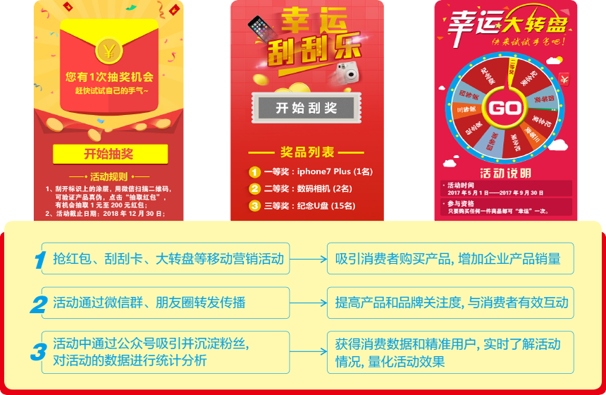 消費(fèi)者購(gòu)買企業(yè)的產(chǎn)品后,掃描標(biāo)識(shí)上的二維碼,參與企業(yè)設(shè)置的搶紅包、刮刮卡、大轉(zhuǎn)盤等營(yíng)銷互動(dòng)活動(dòng),中獎(jiǎng)后直接進(jìn)入微信公眾號(hào)領(lǐng)取,操作簡(jiǎn)單方便,在實(shí)現(xiàn)企業(yè)促進(jìn)產(chǎn)品銷售的同時(shí),還可增加企業(yè)微信公眾號(hào)的粉絲數(shù)量;同時(shí),充分利用移動(dòng)互聯(lián)網(wǎng)易于傳播的特性,實(shí)現(xiàn)企業(yè)品牌的廣泛傳播,采用多種移動(dòng)創(chuàng)新營(yíng)銷方式,結(jié)合數(shù)據(jù)統(tǒng)計(jì)分析,幫助企業(yè)實(shí)現(xiàn)精準(zhǔn)營(yíng)銷;另外,通過(guò)抽獎(jiǎng)、助力、積分兌換等主流營(yíng)銷活動(dòng),吸引、刺激消費(fèi)者持續(xù)消費(fèi)、分享傳播,進(jìn)而有效提高企業(yè)的產(chǎn)品銷量;還有,也可針對(duì)企業(yè)某一種產(chǎn)品進(jìn)行單獨(dú)促銷開展?fàn)I銷活動(dòng),消費(fèi)者掃描二維碼參與營(yíng)銷互動(dòng)活動(dòng),輕松實(shí)現(xiàn)促銷之目的,收集營(yíng)銷活動(dòng)數(shù)據(jù),借助大數(shù)據(jù)分析,分析消費(fèi)者的特征、分布、消費(fèi)習(xí)慣等信息,引導(dǎo)企業(yè)的市場(chǎng)營(yíng)銷戰(zhàn)略和銷售策略,使企業(yè)營(yíng)銷舉措更加精準(zhǔn)有效。