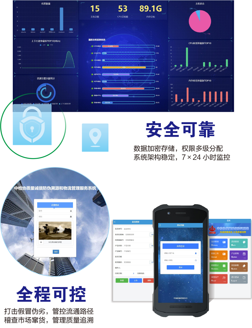 中國(guó)質(zhì)量檢驗(yàn)協(xié)會(huì)防偽溯源和物流管理服務(wù)系統(tǒng)(簡(jiǎn)稱中檢聯(lián)合質(zhì)量誠(chéng)信驗(yàn)證系統(tǒng))是以物聯(lián)網(wǎng)、大數(shù)據(jù)、云計(jì)算、區(qū)塊鏈和移動(dòng)互聯(lián)網(wǎng)技術(shù)為基礎(chǔ)建設(shè)的全過(guò)程防偽溯源與質(zhì)量誠(chéng)信驗(yàn)證服務(wù)平臺(tái),依托廣大技術(shù)機(jī)構(gòu)的技術(shù)支撐,應(yīng)用二維碼為載體,使用一物一碼防偽技術(shù),同時(shí)采用文字、圖片和視頻等多媒體方式,完整記錄產(chǎn)品的原料來(lái)源、生產(chǎn)加工、倉(cāng)儲(chǔ)物流和市場(chǎng)銷售等詳細(xì)信息,融合實(shí)現(xiàn)產(chǎn)品質(zhì)量來(lái)源可查、去向可追、責(zé)任可究的全過(guò)程追溯,切實(shí)方便企業(yè)履行質(zhì)量安全主體責(zé)任并用科技、智能化、信息化的手段去加強(qiáng)質(zhì)量安全風(fēng)險(xiǎn)控制,維護(hù)消費(fèi)者合法權(quán)益,讓人民群眾買得放心、吃得放心、用得放心。