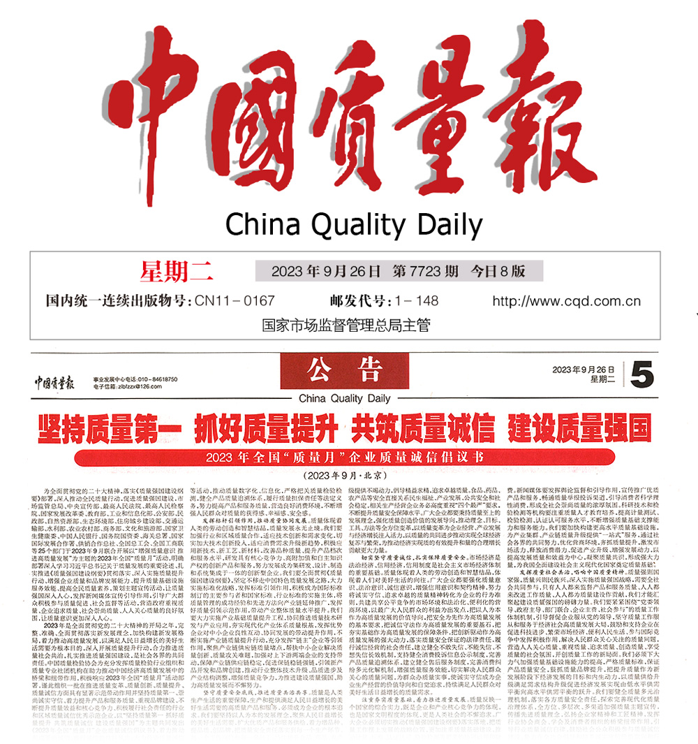 - 中國消費者報——堅持質量第一 抓好質量提升 共筑質量誠信 建設質量強國——2023年全國“質量月”企業(yè)質量誠信倡議書