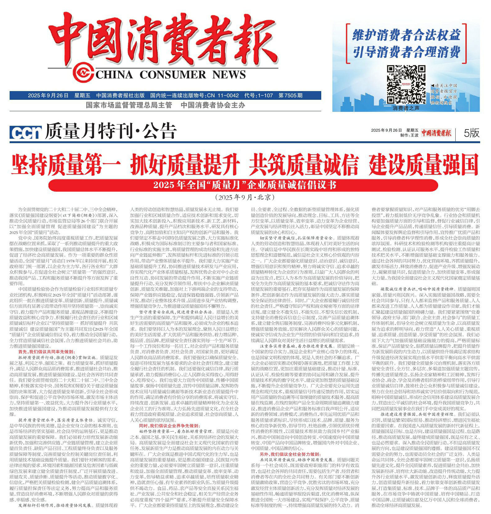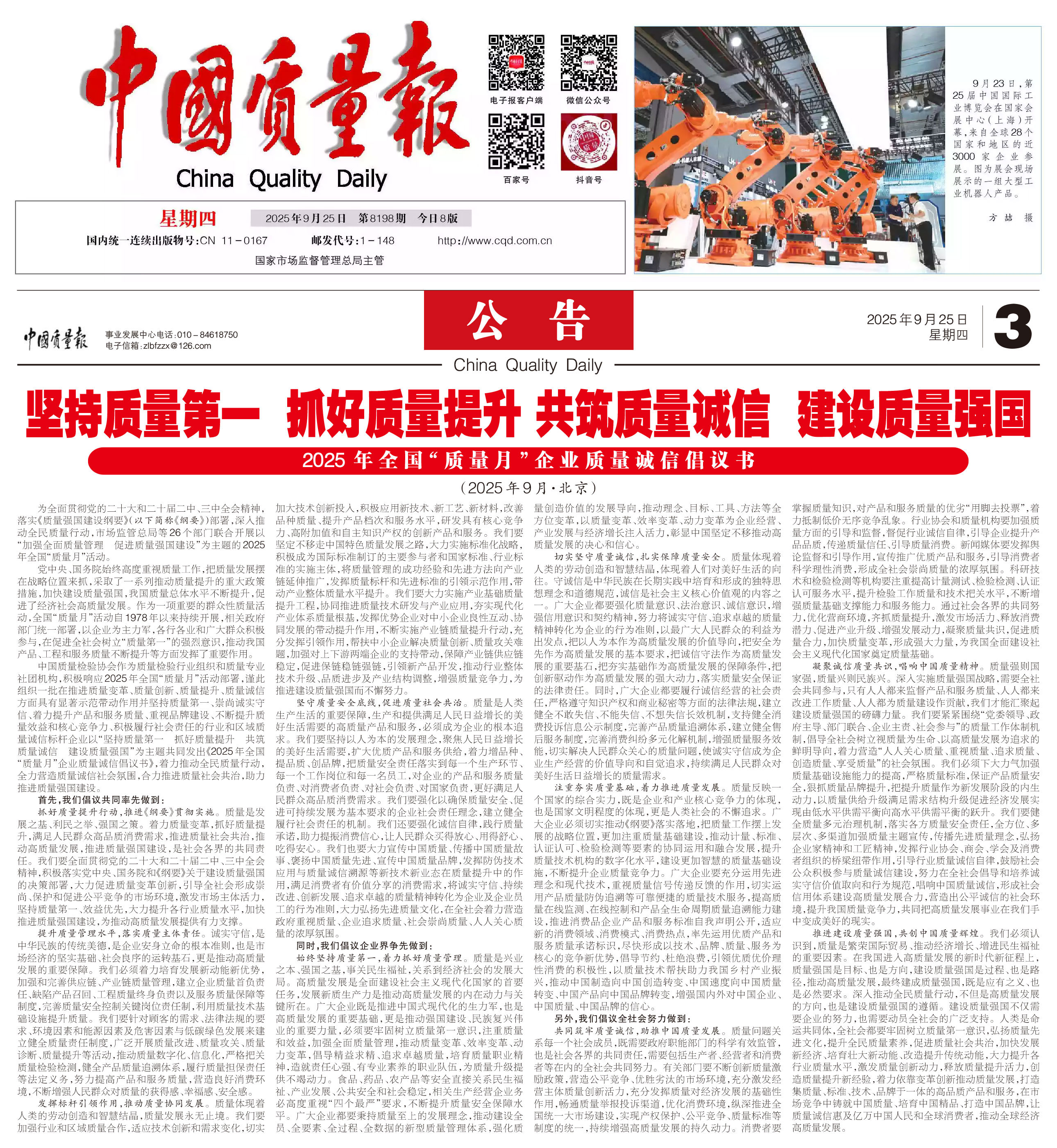 - 《中國質量報》(2025年9月26日刊)發(fā)布:堅持質量第一 抓好質量提升 共筑質量誠信 建設質量強國——2025年全國“質量月”企業(yè)質量誠信倡議書(2025年9月·北京)