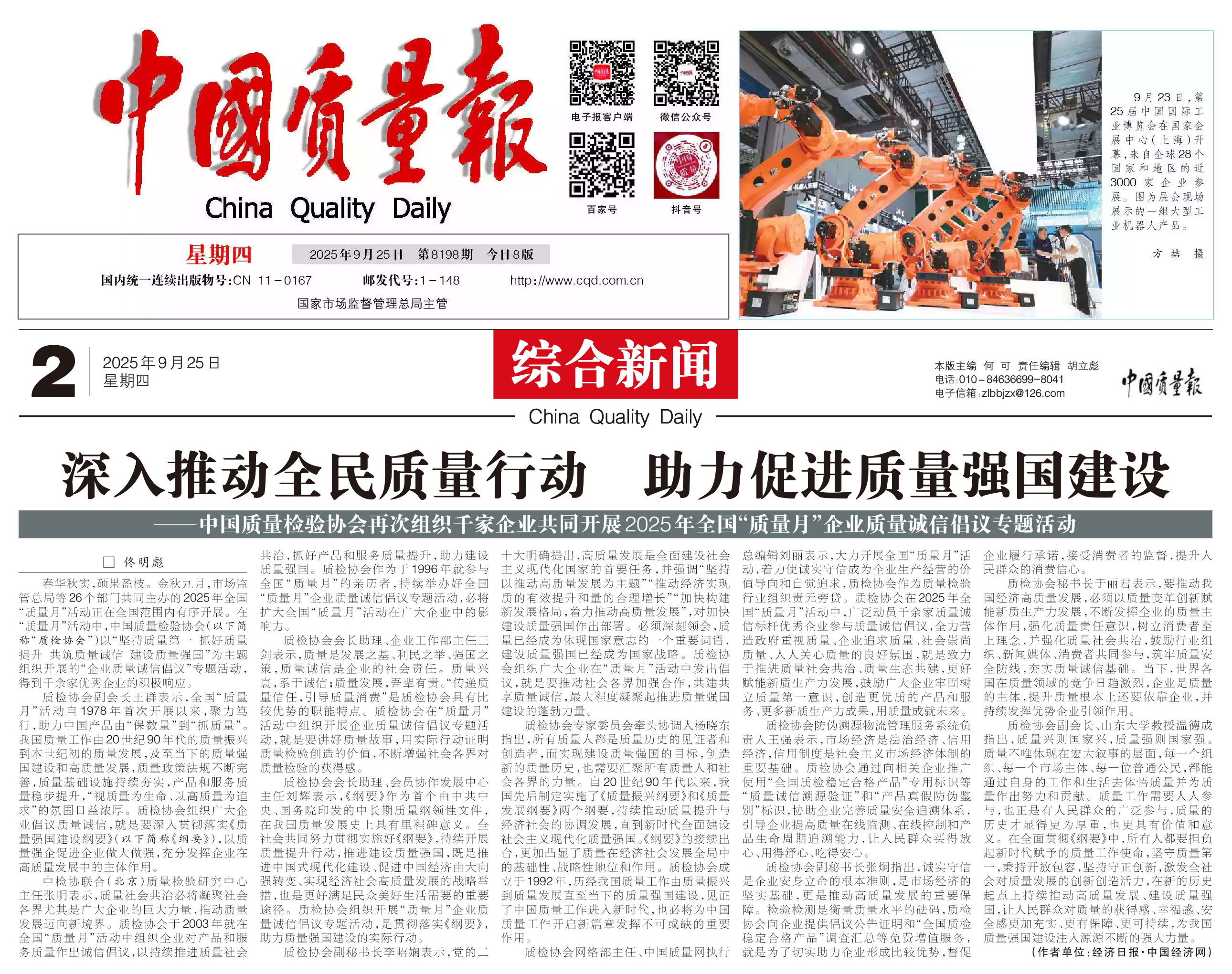 - 《中國質量報》(2025年9月25日刊)發(fā)布:深入推動全民質量行動 助力促進質量強國建設——中國質量檢驗協(xié)會再次組織千家企業(yè)共同開展2025年全國“質量月”企業(yè)質量誠信倡議專題活動