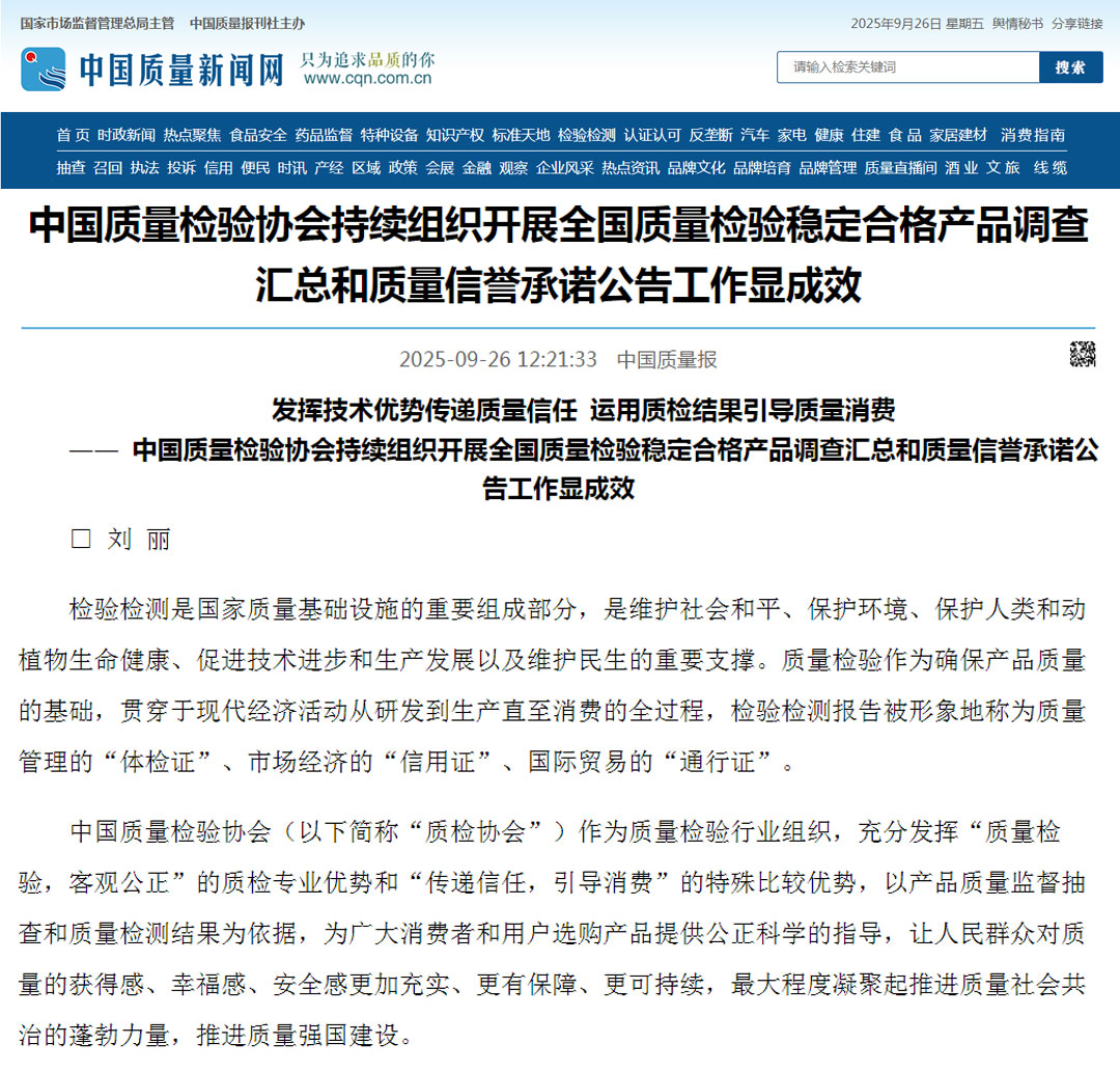 - 《中國質量報》(2025年9月26日刊)發(fā)布:發(fā)揮技術優(yōu)勢傳遞質量信任 運用質檢結果引導質量消費————中國質量檢驗協(xié)會持續(xù)組織開展全國質量檢驗穩(wěn)定合格產(chǎn)品調查匯總和質量信譽承諾公告工作顯成效